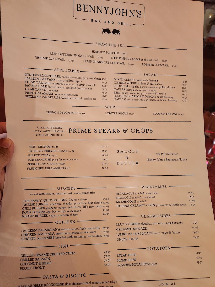 Accompanied by a well-curated drink menu, the atmosphere is relaxed, making it ideal for special occasions or a casual meal. With attentive service from staff like Orlando and Maria, it’s evident that at Benny John’s, every detail is designed to elevate your dining experience. Come savor the charm of this quintessential steak and seafood house!