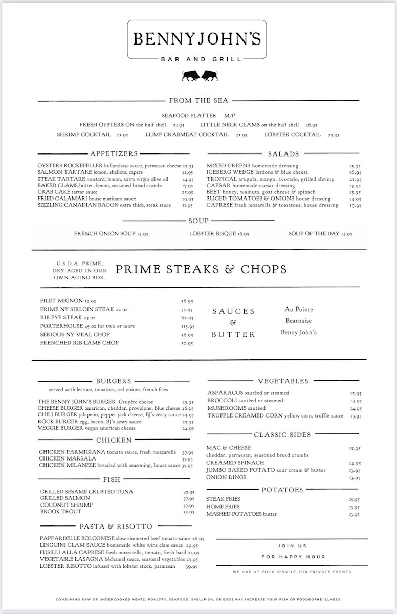 Welcome to Benny John's Bar and Grill, where traditional American cuisine meets a warm, inviting atmosphere on the bustling streets of New York City. Nestled at 8 E 48th St, this gem offers a delectable menu that highlights the best of steak and seafood.